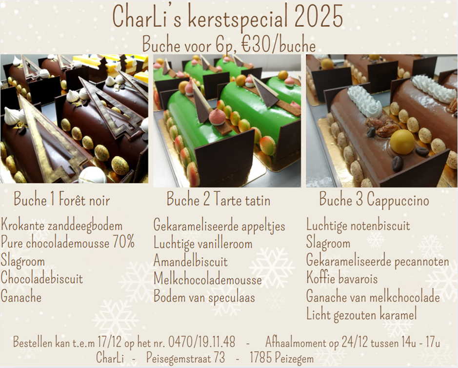 Tijdens de feestdagen draait CharLi op volle toeren. Je kan je kerstbuche bestellen voor op je feesttafel. Smakelijk!